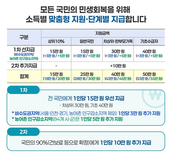- 일반 국민(90%): 최대 55만 원 (1·2차 및 추가 지급 포함)