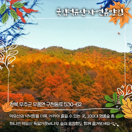 덕유산자연휴양림은 다양한 산책로와 등산로가 마련되어 있어 가을 산행을 즐기는 사람들에게도 인기가 높습니다.