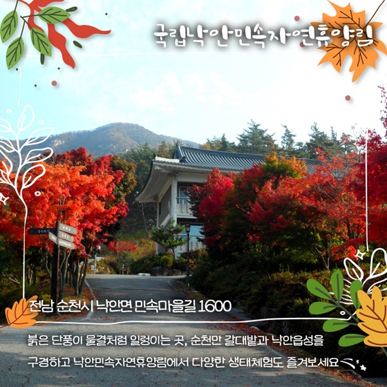 전남 순천에 위치한 낙안민속자연휴양림은 붉은 단풍이 물결치는 아름다운 풍경으로 가을철에 특히 많은 사랑을 받는 곳입니다.