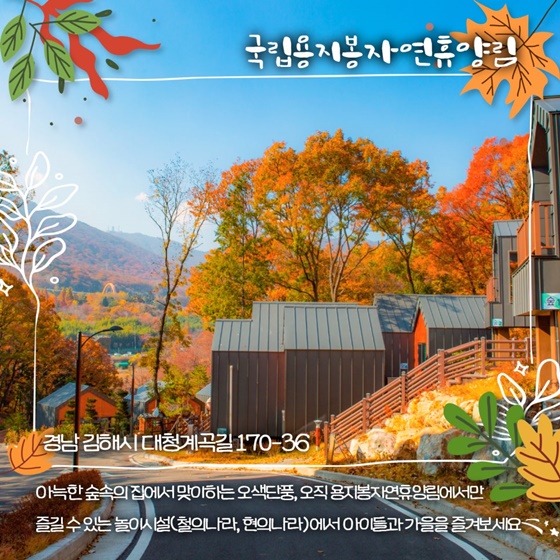 경남 김해에 위치한 용지봉자연휴양림은 대청계곡을 따라 형성된 오색단풍이 매우 매력적인 장소입니다. 이곳에서는 숲속의 집과 같은 아늑한 숙박 시설에서 머무르며, 단풍이 물든 자연 경관을 감상할 수 있습니다.