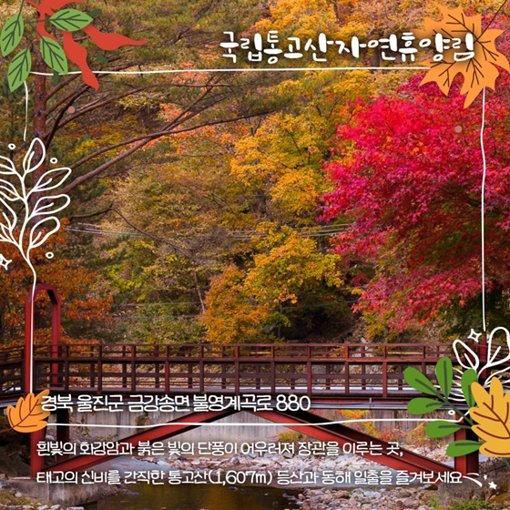 경북 울진에 위치한 통고산자연휴양림은 장엄한 단풍 경관과 더불어 태고의 신비를 간직한 자연 환경으로 유명합니다.