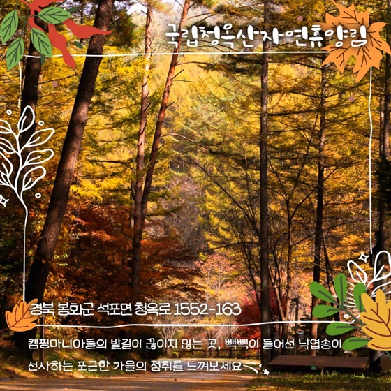 자연의 소리를 들으며 가을을 보내고 싶은 분들에게 청옥산자연휴양림은 최고의 캠핑 명소로 추천됩니다.