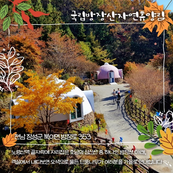 이곳에서는 자연 그대로의 숲속을 산책하며 가을의 정취를 느낄 수 있습니다. 가을철 방장산의 단풍은 붉고 황금빛으로 물들어 방문객들에게 깊은 인상을 남깁니다.