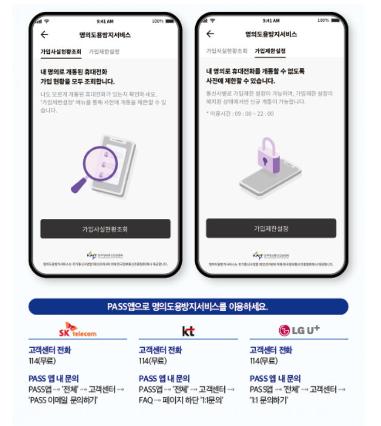 개통된 휴대폰 현황, 통신사 가입 내역 등을 확인할 수 있어 의심스러운 거래를 점검할 수 있습니다. - 명의 사용 제한 설정